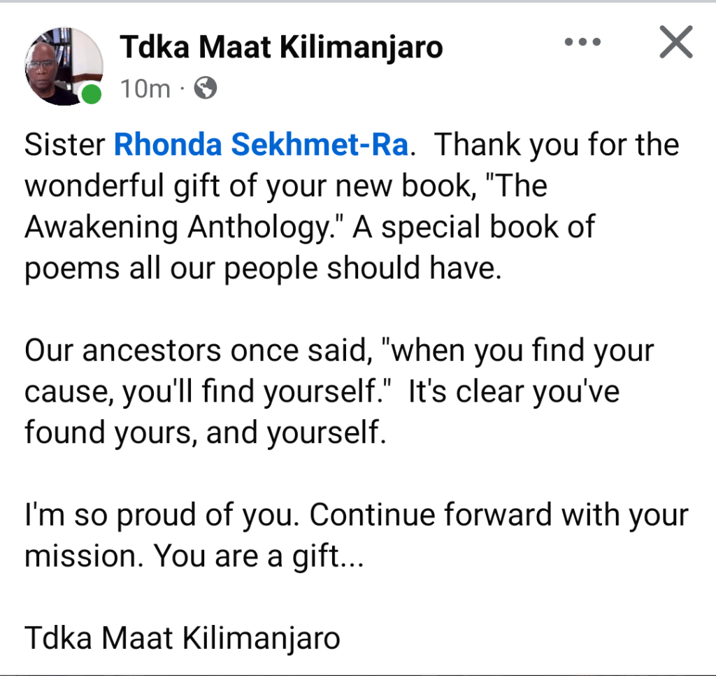 “The Awakening Anthology” is a collection of 49 poems written by poet & spoken word artist Rhonda Sekhmet Ra from 2014-2021, conveying a 7 year journey through racial consciousness.