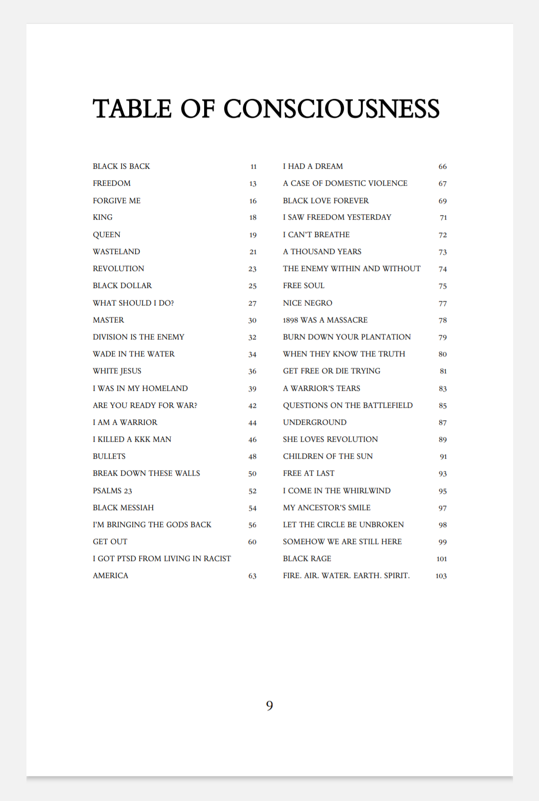 The poems in this book speak to Black/African oppression, history, struggle, evolution, spirituality, rage and redemption.