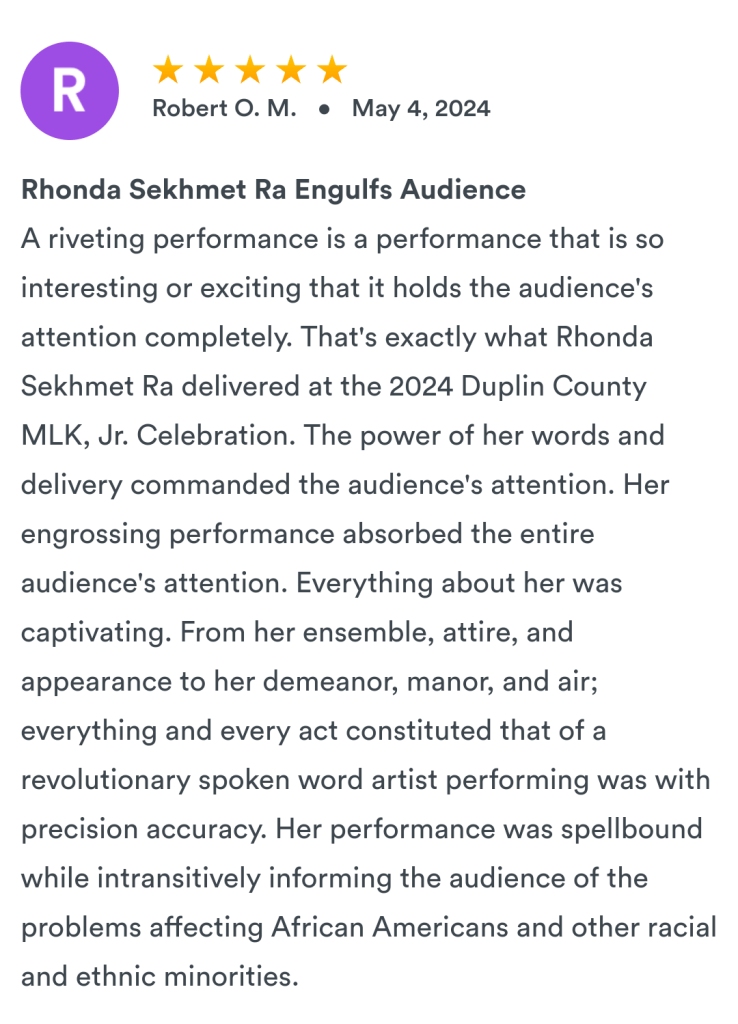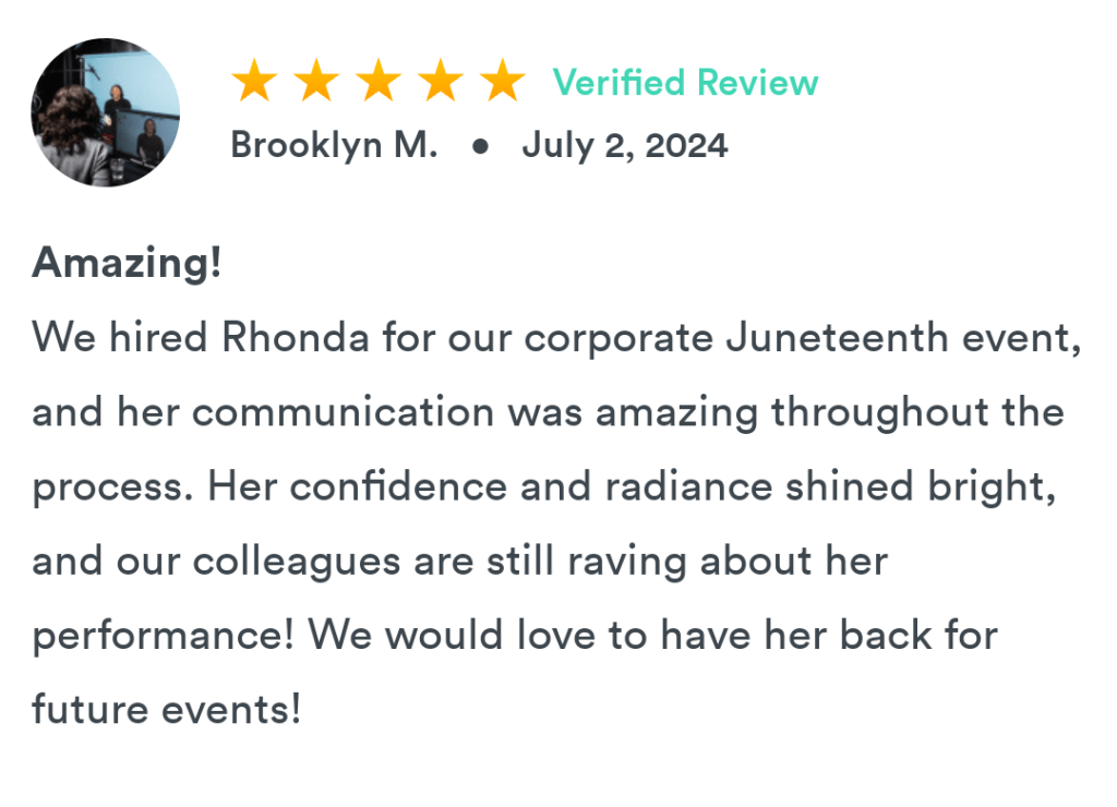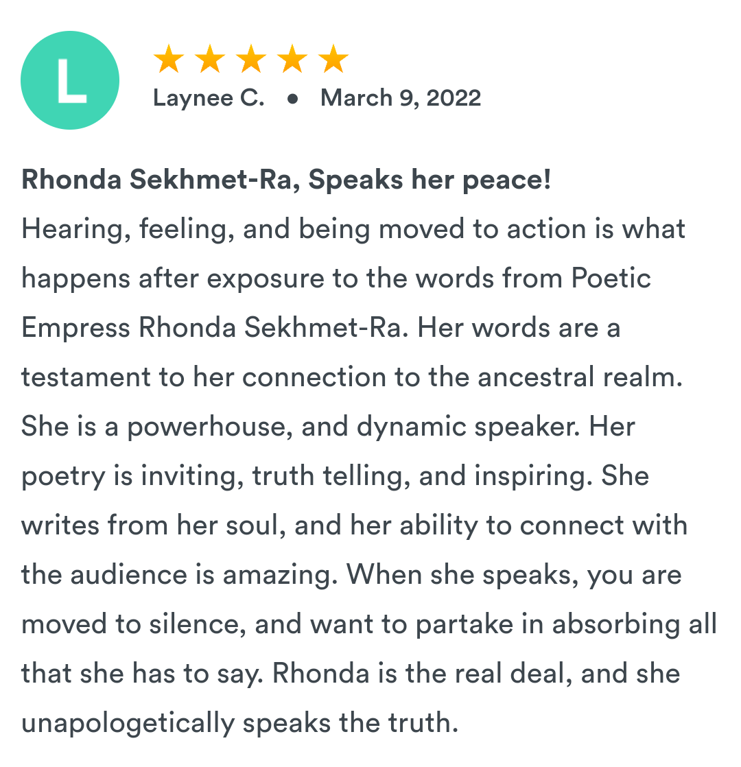 Rhonda is currently available for virtual and in-person spoken word performances within the state of North Carolina and beyond. Performances outside of North Carolina must be booked at least 30 days in advance. All performances require a signed agreement and are up to the discretion of the artist.